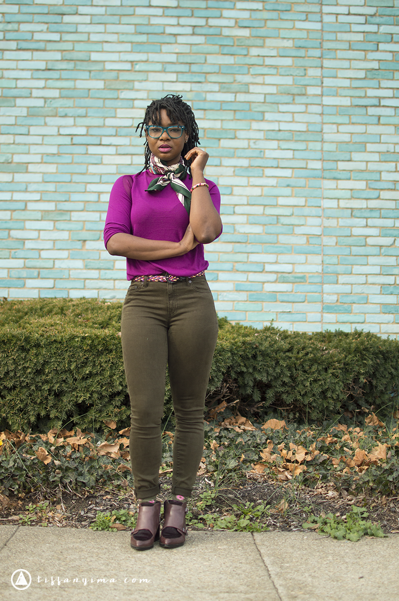 I could tone down the entire look by adding a gray or brown blazer. If I changed the shirt to something closer to my skin tone, the look would be more demure and unassuming.